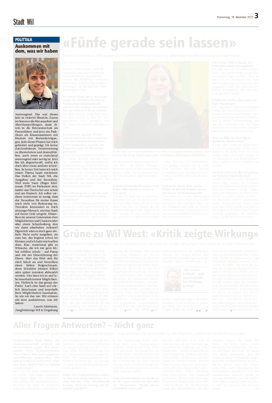 Laurin Edelmann, unser Mitglied der Jungfreisinnigen Wil & Umgebung, äusserte sich im Polittalk der Wiler Nachrichten (Ausgabe vom 19. Dezember 2025) zu den Stadtfinanzen. Er hat ein anspruchsvolles Jahr hinter sich: Maturaarbeit, Abschlussprüfungen, Rekrutenschule als Panzerfahrer und nun ein Praktikum als Klassenassistent bei Kindern mit Beeinträchtigungen. Gerade weil er gelernt hat, mit begrenzten Mitteln hauszuhalten, beschäftigt ihn die Finanzpolitik der Stadt Wil besonders – das Defizit, die steigenden Ausgaben und der Steuerfuss. Obwohl Laurin selbst kaum Steuern zahlt, fragt er sich umso mehr, ob seine Generation dereinst Chancen erben wird – oder vor allem Schulden.